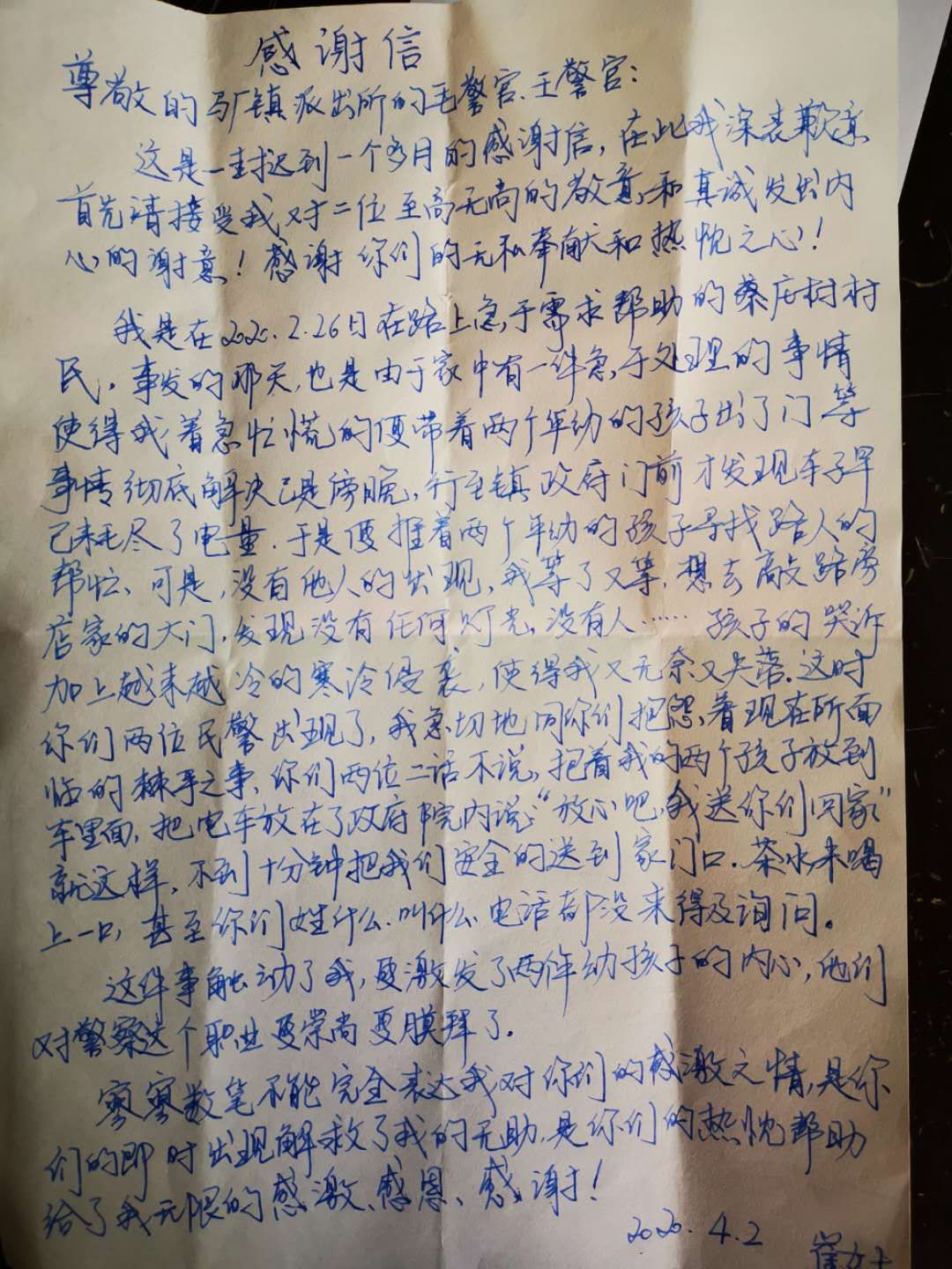從聊天中得知,該女士姓崔,家距離衛(wèi)生院較遠(yuǎn)而且家里有兩名老人,她的丈夫又在外地。看完病,派出所所長毛衛(wèi)庚指示巡警民警把崔女士和孩子們安全護(hù)送到家。后來,崔女士家人多次聯(lián)系毛衛(wèi)庚說要表示感謝,都被民警們謝絕。