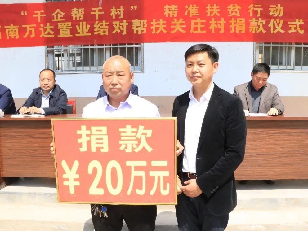 4月13日上午,河南萬達置業(yè)有限公司結(jié)對幫扶捐款儀式在市城鄉(xiāng)一體化示范區(qū)許灣鄉(xiāng)關(guān)莊行政村隆重舉行。現(xiàn)場,該公司為關(guān)莊行政村捐款20萬元助力脫貧攻堅。