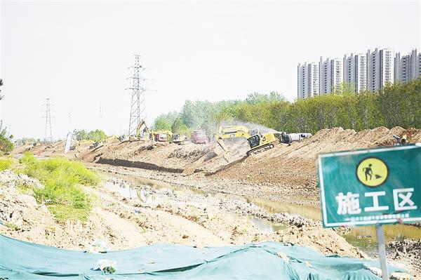 4月15日上午,洼沖溝水系植物園杜樓橋施工現場,幾十輛工程機械車緊張作業,熱火朝天的施工場景令人振奮。