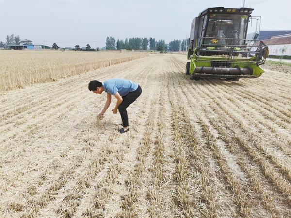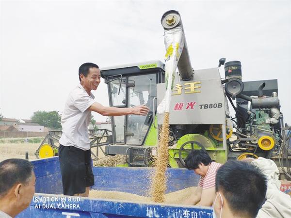日前,我市小麥相繼進入成熟期,田地里一片金黃,滾滾麥浪中收割機來回穿梭,農民已經開始收麥了。圖為5月24日上午,沈丘縣李老莊鄉部分麥子開始收割,飽滿的麥粒從收割機中流出,農民的臉上綻放出笑容。