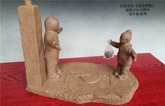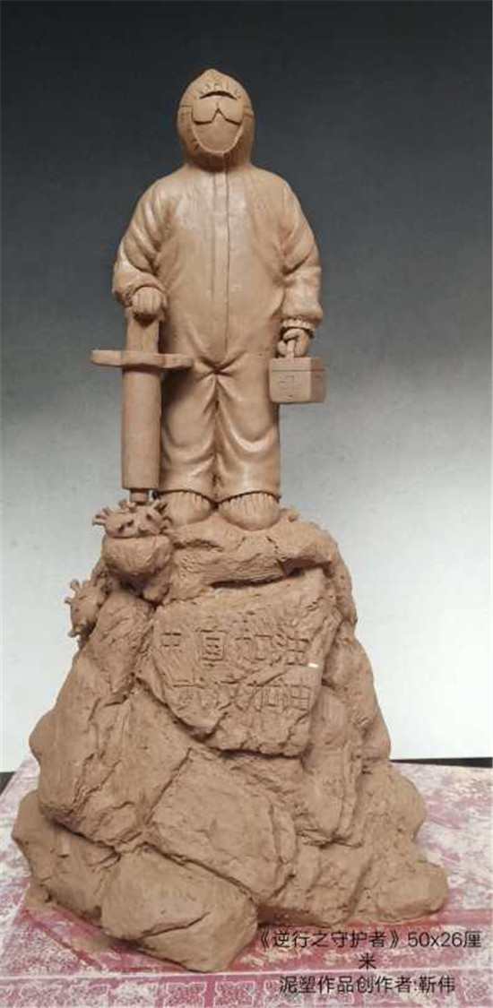 所捐《逆行之守護者》泥塑作品,高50厘米,寬26厘米,描述全副武裝的醫護工作者一手握針管殺死病毒,一手提藥箱救人,謳歌了疫情中逆行的醫護工作者不畏犧牲、與新冠病毒搏斗,冒死救治病毒感染者的偉大精神。《隔空擁抱》是講述我市扶溝縣人民醫院抗疫故事,疫情期間奮戰在抗疫一線的劉海燕醫生和為自己送年夜飯的女孩隔空擁抱的感人場景,讓無數人熱淚盈眶。