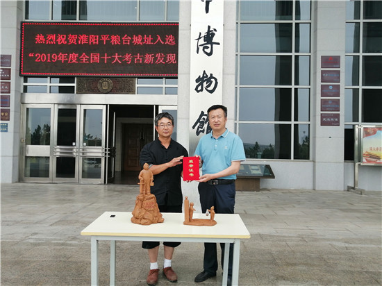6月12日,在2020年“文化和自然遺產日”即將來臨之際,淮陽區市級非物質文化傳承人靳偉向市博物館捐贈“抗疫”泥塑作品《逆行之守護者》《隔空擁抱》,以表達藝術家對新冠肺炎疫情期間全國醫務人員無私精神的敬意。周建山館長向靳偉頒發榮譽證書。