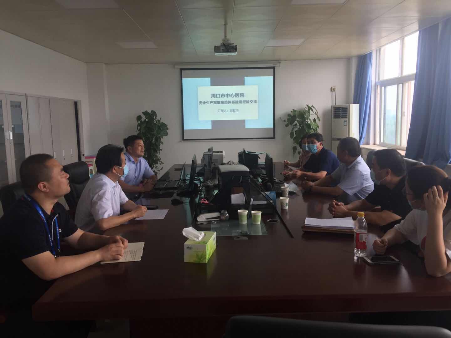 6月15日下午,扶溝縣人民醫院一行6人來到周口市中心醫院對安全生產雙重預防體系建設工作進行參觀交流,市中心醫院副院長呂燕平、保衛科科長劉獻華、醫聯部主任張小虎陪同。
