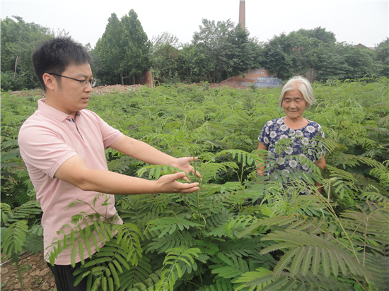 前幾年,朱桂蘭家2畝田地因為沒有出路,每到收莊稼時都要靠人背肩扛。董珍跟朱桂蘭商量,不種莊稼種苗木,既少掏勁,又多收入。朱桂蘭卻說,種了一輩子莊稼不會種苗木啊,再說,種的苗木賣給誰啊?董珍給老人打下保證,樹苗管理由我負責,銷路的話我幫您聯系。這下,老人才放下心來。去年春季,董珍從網上購買了2畝地的合歡樹種子,同統戰部駐村隊員一起育上苗,并按時打杈去枝,進行科學管理。現在,2畝合歡樹苗長到一米多高,老人每天都要到地里看一次樹苗,每次都是滿臉笑容。不知內情的人問老人,這么大年紀還會種合歡樹?朱桂蘭老人總是笑答:“是董書記幫俺種的。”