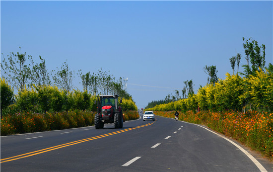 9月2日,富裕起來的農民駕車行駛在商水縣高標準農田示范區內兩側開滿鮮花的田間道路上。秋天到來,5萬畝示范區內縱橫交叉的近20公里田間道路兩側混種的格桑花、波斯菊、百日草等在燦爛的陽光下爭奇斗艷,與長勢喜人、豐收在望的秋作物相映成輝,引來許多市民前來觀賞。記者付永奇攝