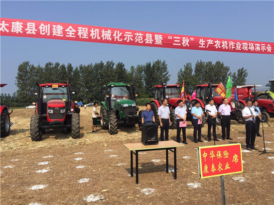 9月1日,太康縣在楊廟鄉(xiāng)召開創(chuàng)建全國全程機(jī)械化示范縣暨“三秋”生產(chǎn)農(nóng)機(jī)作業(yè)現(xiàn)場演示會。市農(nóng)機(jī)局局長劉偉,縣長李錫勇,副縣長孟濤,縣政府黨組成員、政府辦公室主任程勇出席會議。各鄉(xiāng)鎮(zhèn)鄉(xiāng)鎮(zhèn)長,縣農(nóng)業(yè)機(jī)械服務(wù)中心班子成員,楊廟鄉(xiāng)黨委政府班子成員、楊廟鄉(xiāng)各行政村兩委班子及群眾代表,全縣農(nóng)機(jī)合作社理事長及成員代表,部分農(nóng)機(jī)大戶、種植大戶、養(yǎng)殖大戶,全縣農(nóng)機(jī)經(jīng)銷商和全國部分農(nóng)機(jī)生產(chǎn)廠家代表、中華保險周口公司太康公司負(fù)責(zé)人等參加會議。副縣長孟濤主持會議。