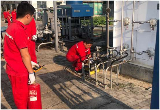 演練的第一部分,中央管道照出濃煙,工作人員發現中央管道發生天然氣泄漏,立即采取應急措施。發生管道的泄露首先控制火源,盡快把聚集的天然氣驅散。演練第二部分,加氣站發生儲氣井泄露事故,由于儲氣井閥門損壞導致天然氣泄露,加氣站工作人員與消防大隊按程序迅速的采取相關措施制止事態進一步發展。