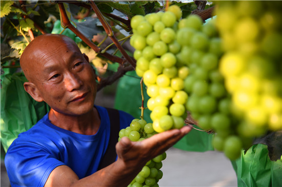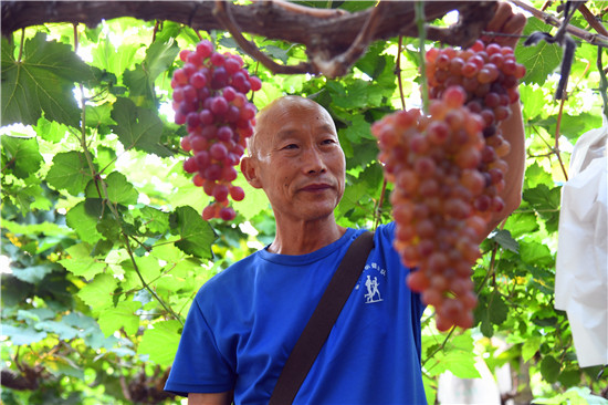 9月10日,商水縣農業專家劉啟山在綠苑葡萄園內察看葡萄生長情況。