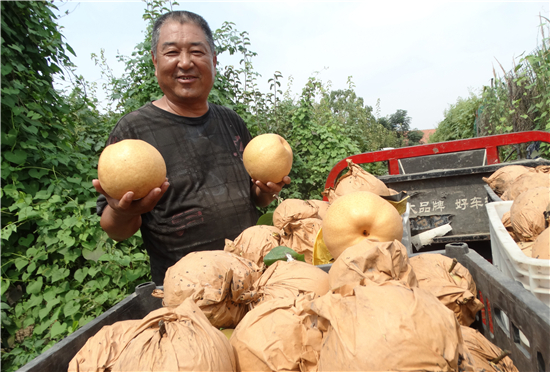 走進(jìn)一排排枝繁葉茂的梨園基地,葉子在陽光的映襯下泛著綠油油的光亮,套著袋的黃金梨掛滿了枝頭。“恁瞧瞧這金黃色的梨果,長的多喜人,最大的梨果估摸著有三斤多重,最小的也有斤把重,皮薄肉厚汁多,既香甜可口,又無核無渣,很是俏銷。”采摘期間,果農(nóng)們歡聲笑語,興致勃勃地說。