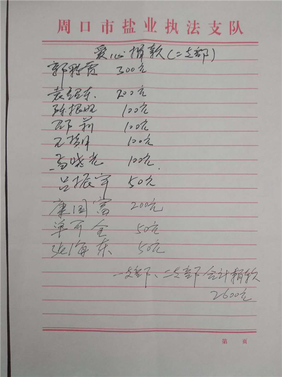 支隊黨委得知這一情況后,高度重視,隨即向全體黨員發起了《捐款獻愛心倡議書》,號召全體黨員進行捐款,奉獻一份愛心。第一、第二黨支部積極行動,大家踴躍捐款。截止到11日上午,共捐款2600元。