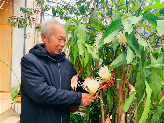 在周口市中心城區的一個家屬院里,記者見到了88歲的苗天才和他養的曇花,“一株21年樹齡的曇花開了43朵,另外兩株5年樹齡的曇花加起來開了13朵,這3株曇花一共開了56朵。”苗天才說,早上四五點的時候曇花就慢慢地開放了,到現在五六個小時過去了曇花還保持著開放狀態。