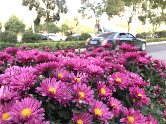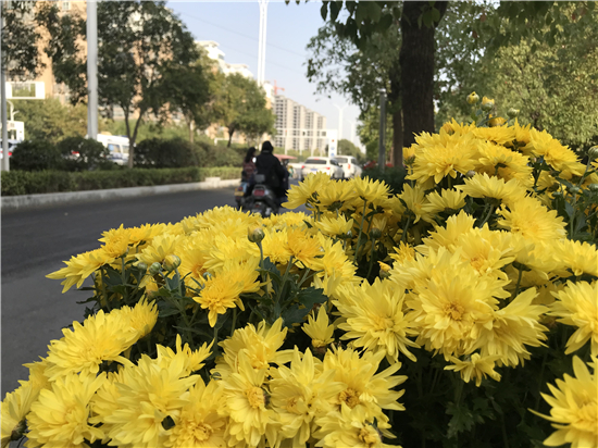 10月23日,霜降時節,百花早已在寒風中凋零,而菊花卻傲骨迎風怒放。在周口大道與慶豐東路交叉口,朵朵菊花在陽光的照耀下,顯得清淡高雅、卓爾不凡,醉了清風、迷了行人。②8