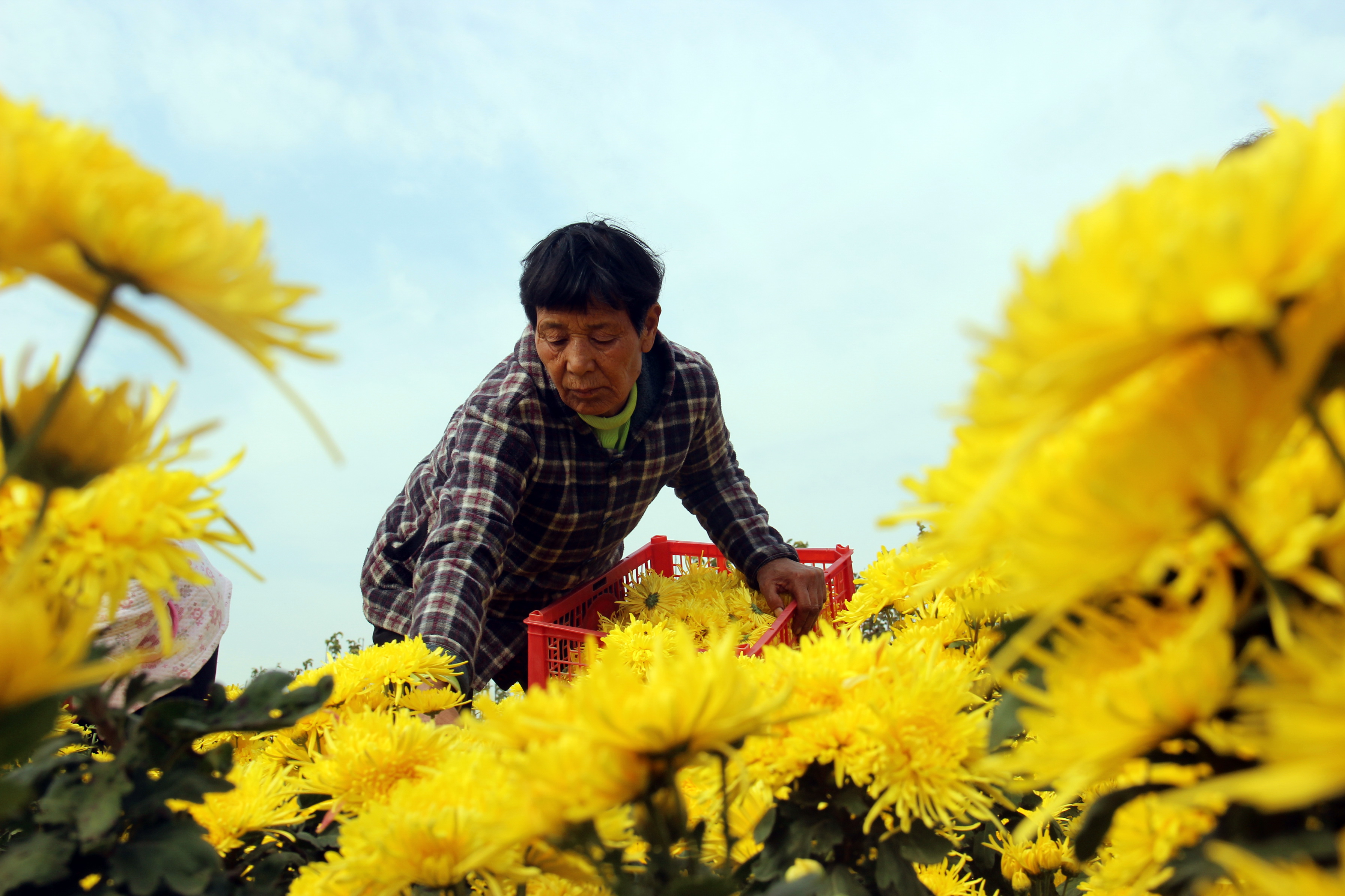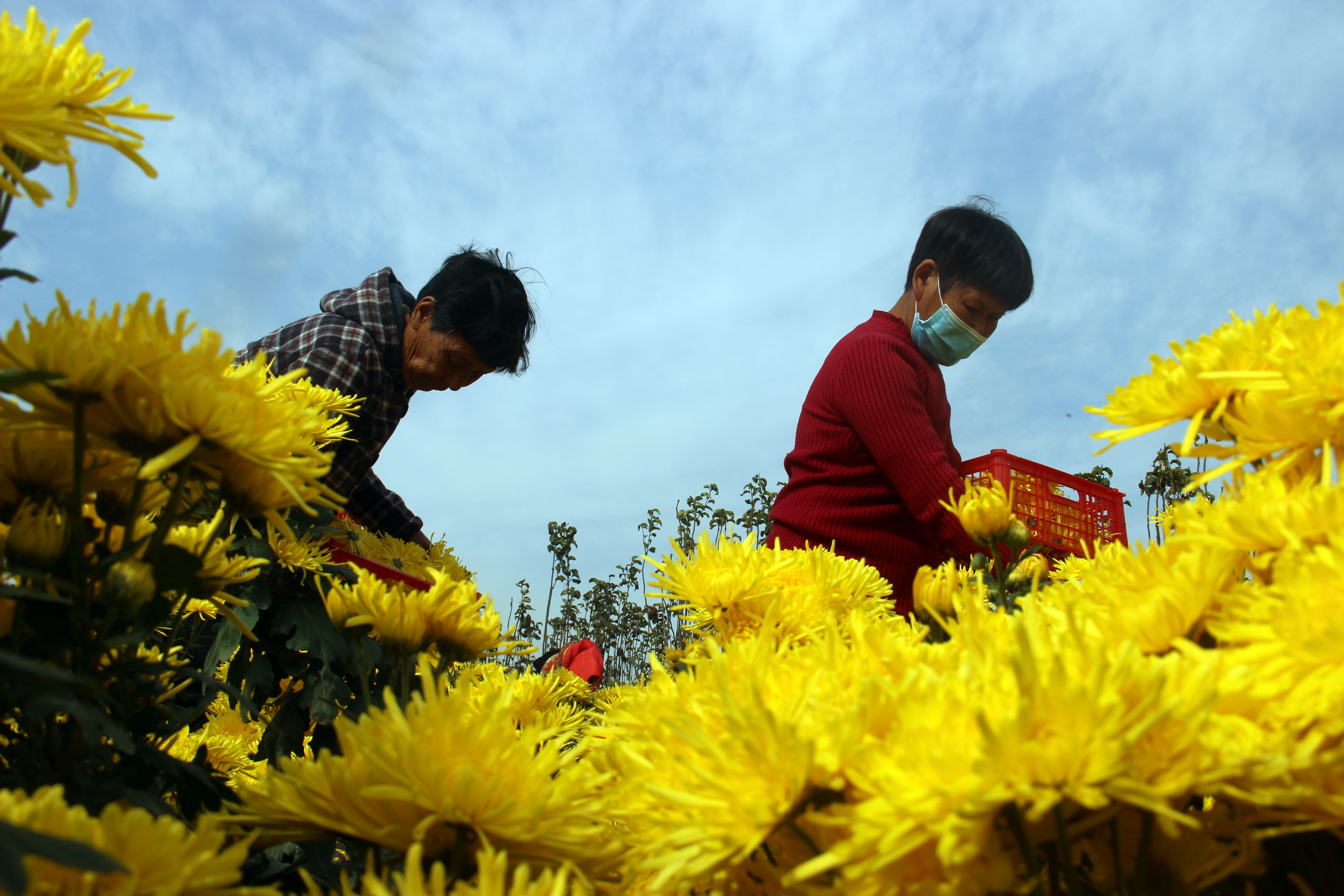 11月3日,商水縣郝崗鎮大路李村貧困戶婦女在李華生的合作社采收金絲黃菊。郝崗鎮政府鼓勵大路李村負責人李華生引進金絲黃菊種植帶動貧困戶增收致富,目前該村種植面積達到百畝,畝效益均在6000元以上。記者付永奇通訊員呂耀光攝