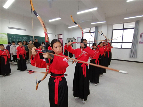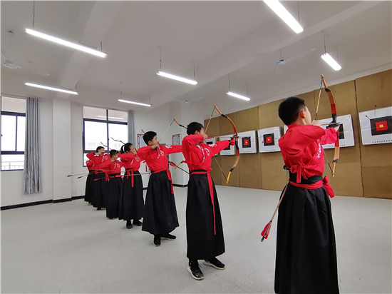在皮營學?;顒邮?,學校舞蹈社團的小朋友展示了傳統儀式《鹿鳴》,深情的演繹,展示了他們對國學經典的理解。禮射是禮樂文明重要組成部分,習射先習禮,射以觀德。習射可以強健體魄,其中還蘊含了眾多古人先賢的智慧。皮營學校禮射興趣班的小朋友進行禮射表演,隨著挾矢,正筈,審固,舉弓,引彀,發矢,斂弓,執弦等一系列指令,拈弓搭弦展示禮射八法。在這里,學生們通過不同方式的展示,詮釋自己對“禮”“樂”的理解和認知。
