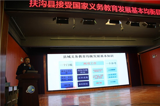 會上,縣教體局黨組成員、督學李軍峰通報了義務教育發展基本均衡縣復驗工作第二次評估復驗工作督導反饋情況;副局長吳春輝傳達了11月20日河南省義務教育均衡發展接受國家評估驗收電視電話會議精神,宣讀了義務教育發展基本均衡縣國家認定復驗學校必做20條;副局長嚴然主持會議并宣讀了《扶溝縣教育體育局接受義務教育發展基本均衡縣國家評估認定的工作方案》。