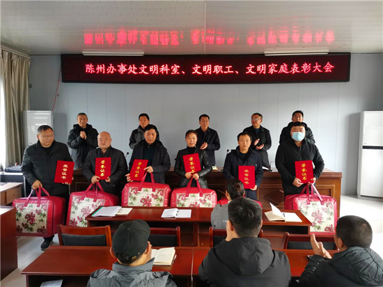 疫情防控辦公室、黨政辦公室獲得“文明科室”稱號;王志國、史路路獲得“文明職工”稱號;鄒亮家庭、武志強家庭等6個家庭獲得“文明家庭”稱號。大會為獲獎集體和個人頒發了獎牌、榮譽證書和獎品。取得榮譽的先進集體和個人,集中展示了陳州辦事處的文明形象和干部職工的職業道德、家庭美德和個人品德,為文明單位創建增添光彩。