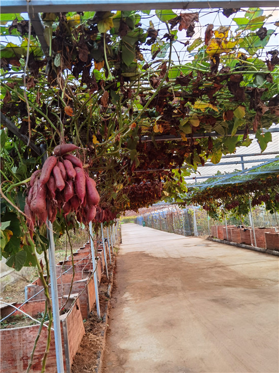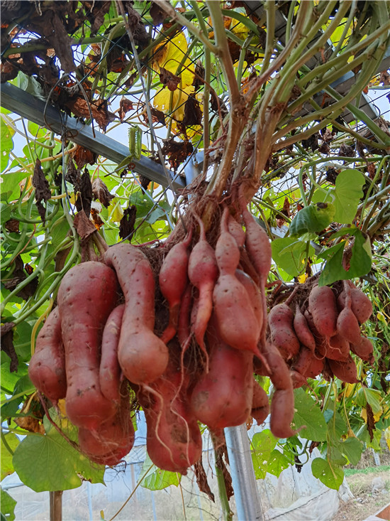 西華縣農科所積極開展“空中結薯”試驗種植研究,并取得成功。“空中結薯”采取嫁接技術,選用旋花科植物牽牛作砧木,脫毒薯苗作接穗嫁接而成,嫁接成活后栽到土壤里,搭建棚子,加強薯苗水肥管理,每株插一根小竹木桿,促進薯苗快速生長上棚,在棚上吊花盆,盆內放蛭石,生長到掤上的薯秧壓到花盆里,加強水肥管理。90天結薯,進入10月份把花盆去掉。該技術打破傳統栽培方式,主要為公園、科技園區、農業生態觀光園、家庭庭院內培植,有很好的科研價值、觀賞價值和農業推廣價值。周口日報·周道客戶端記者李鳳霞 攝