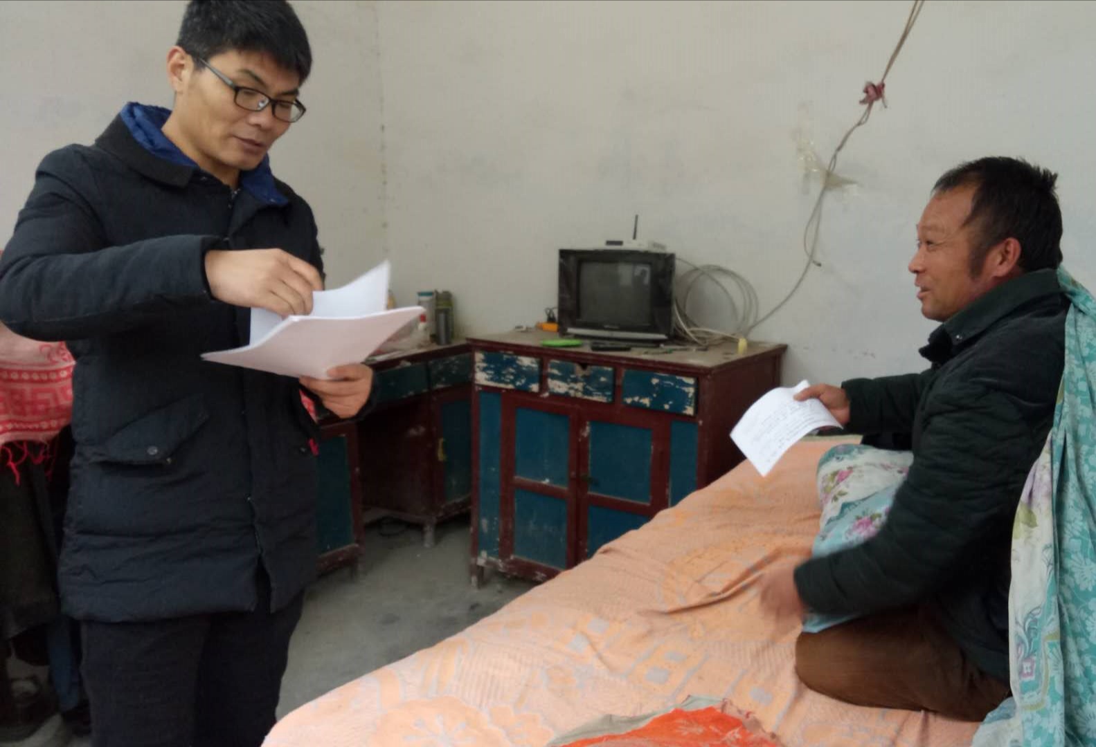 圖片說明:位全峰(左)到北嶺村殘疾貧困戶家中了解情況,講解殘疾貧困戶應享受的扶貧政策。