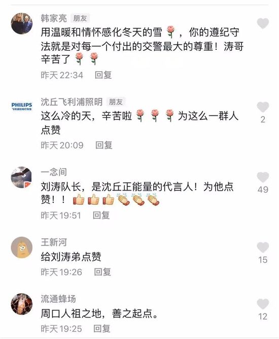 2021年元旦,記者聯系聯系上了視頻中的主人公——沈丘縣交警大隊城市中隊劉濤中隊長,雖然是元旦假日,他依然堅守在崗位上,他告訴記者,這是一名交警工作的日常,沒有想到自己和同事們的一個小舉動能獲得無數網友好評,這給了他們在以后工作中更大的動力,劉濤表示,風雪無阻,滾滾車流中,他將為全縣人民的安全出行繼續堅守崗位。