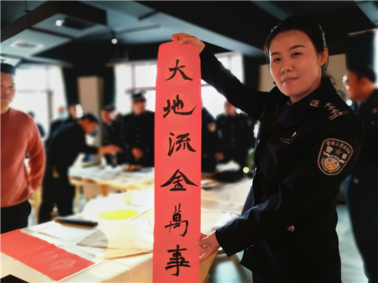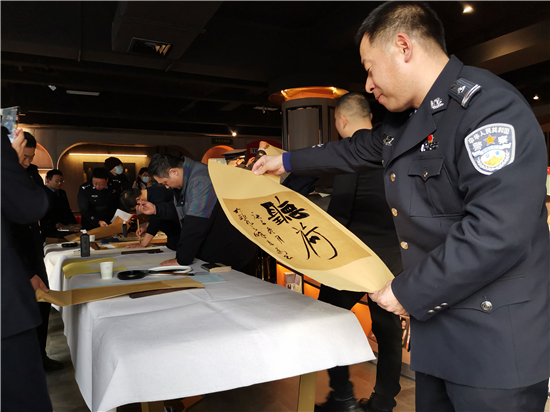 活動現場,氣氛熱烈,書法家們現場揮毫潑墨、筆走龍蛇,帶著喜迎牛年的美好祝愿。民警、輔警爭相圍觀,觀看、揣摩書法家們蒼勁有力的書法作品,房間內洋溢著濃郁的節日氣息。