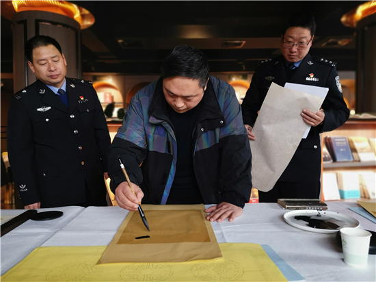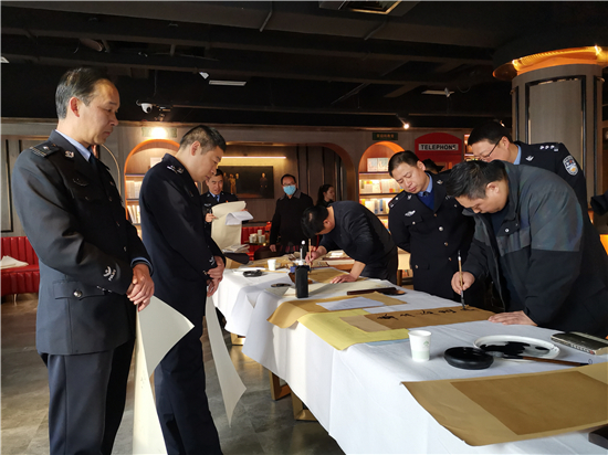 1月10日下午,沽讀書廊二樓翰墨飄香、筆鋒頓挫。為慶祝首個中國警察節,書法家李為、何巖、陳濤、游富華、何祥峰、李雯云、軒敬賢以及祁庚鑫等一行,為川匯區公安分區民警義寫書法作品,送來一份特殊的節日禮物。