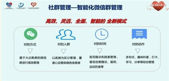健康關(guān)愛(ài)群,是一種智能化微信群,利用“互聯(lián)網(wǎng)+技術(shù)”,突破空間限制,多渠道分享專業(yè)的疾病管理知識(shí),鼓勵(lì)患者每日監(jiān)測(cè)體重、血壓、合理健康飲食與運(yùn)動(dòng)、規(guī)律按時(shí)服藥,以提高患者治療過(guò)程中的參與度,養(yǎng)成良好的習(xí)慣,全面改善心血管疾病醫(yī)療服務(wù)。