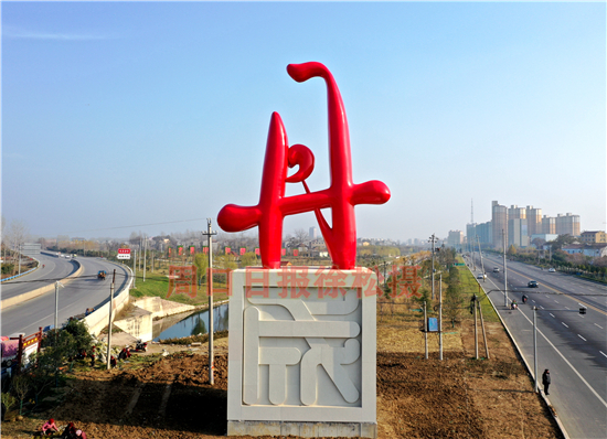 “丹”。對,請隨周口日報記者的鏡頭從這個“丹”字開始。遙遙望去,確實是一個赤紅色的“丹”字,大家第一感覺就會聯想到鄲城是相傳是“老子煉丹”成功之地。顧名思義,這個高約20米的巨型雕塑就是這個寓意。