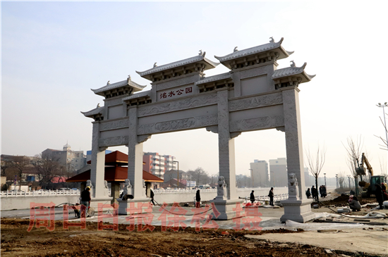 其中,洺河南岸洺水公園的整座門樓采用芝麻白花崗巖石材雕刻拼裝而成,門樓高9米,寬15.6米,雕刻深度3cm,大門的設計效果顯得端莊而又彰顯了鄲城縣的城市文化底蘊。