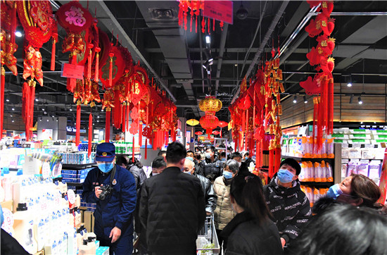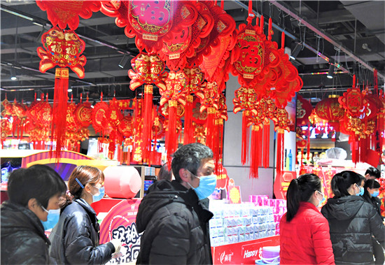 2月9日上午,商水縣行政路一大型超市內(nèi)年貨充足,人流如織,市民自覺佩戴口罩進(jìn)入商場“掃貨”。
