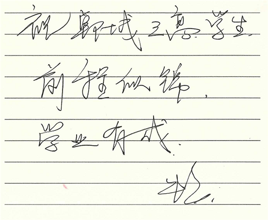 朱婷雖然很少回家,但是一直關注老家鄲城的發展變化,特別關注鄲城的教育發展,當她得知鄲城三高率先提煉出“孝、勤、韌、忠、濟”為核心的朱婷精神,并把這種精神作為鄲城三高學子的精神引領時非常感動,為鄲城三高始終堅持立德樹人的教育理念而高興,為鄲城三高學子的拼搏進取精神而欣慰,為鄲城三高辦學成果而點贊,并欣然寫下:“ 祝鄲城三高越來越好,圓農家子弟大學夢;祝鄲城三高學生前程似錦,學業有成。”