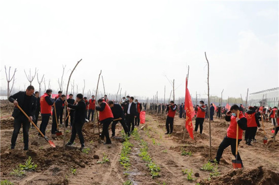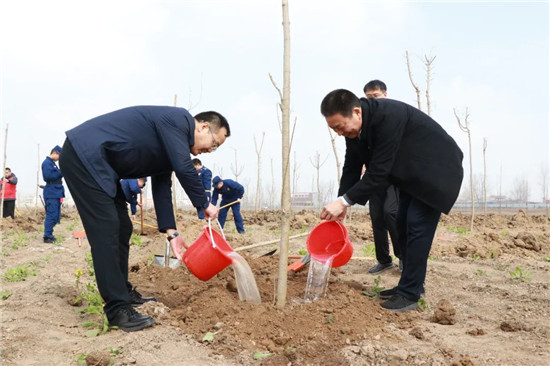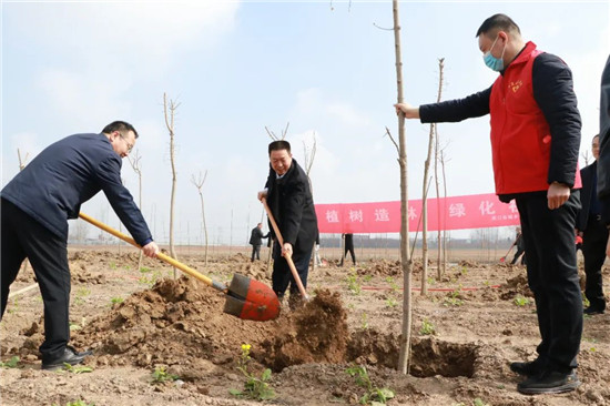 上午9時許,云開霧散,暖陽斜照。在周口建業綠色基地荒片地里,沒有繁瑣的儀式,閆立超、張建黨帶領全區干部職工代表來到植樹點,擼起袖子彎下腰,撲下身子拿起鍬,料峭的春風也無法阻擋大家的熱情,熟練的扶苗、培土、澆水,栽種下一棵棵樹苗,植樹現場呈現出一派熱火朝天的勞動景象。