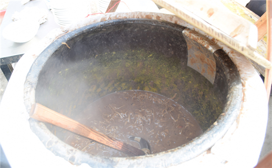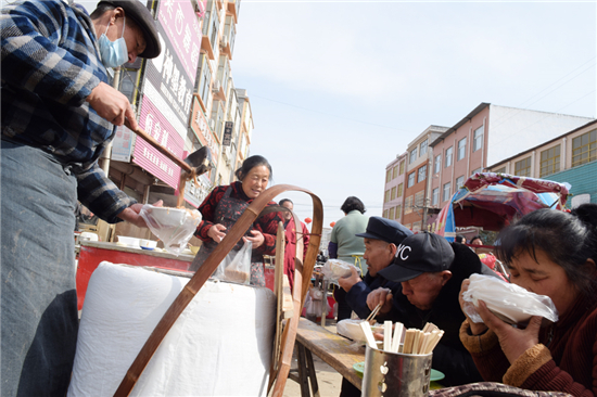 東夏亭鎮的劉家豆沫沒有青菜,豆腐皮多,格外粘稠,和周口其他地方的豆沫不同,味道醇厚、清香,是鎮上最受歡迎的一道美味,從清晨集市開始到中午散集,前來喝豆沫的絡繹不絕,兩大鍋豆沫賣個凈光。
