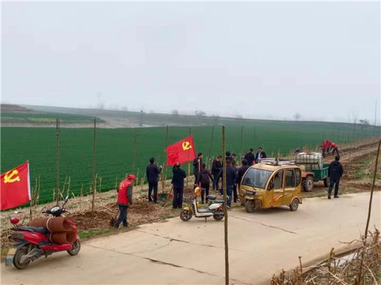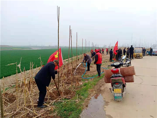 植樹現(xiàn)場(chǎng),一面面鮮艷的紅色黨旗迎風(fēng)飄揚(yáng),參與植樹的同志們密切配合,有人挖坑,有人運(yùn)送樹苗,有人扶樹苗,有人澆水,有人封坑,一派繁忙、有序、火熱的勞動(dòng)場(chǎng)景。