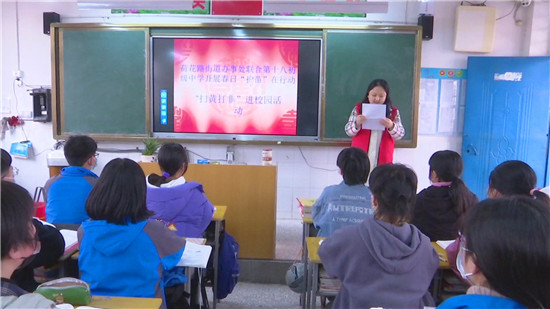 3月16日下午,川匯區荷花路街道辦事處新時代文明實踐所組織志愿者走進第十八初級中學,開展春日“護苗”在行動 “掃黃打非”進校園主題教育活動。