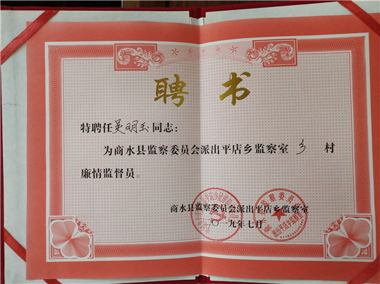 “我鄉(xiāng)劉樓村黨支部書記吳明玉敢于擔(dān)當(dāng),一身正氣,認(rèn)真履行村干部的工作職責(zé),在全鄉(xiāng)起了很好的示范作用,經(jīng)鄉(xiāng)紀(jì)委研究報請鄉(xiāng)主要領(lǐng)導(dǎo)同意,特對吳明玉進行通報表揚,即日起聘請吳明玉同志為平店鄉(xiāng)廉情監(jiān)督員。請吳明玉同志上臺接受聘書......”近日,商水縣平店鄉(xiāng)召開例會,縣紀(jì)委委員、鄉(xiāng)黨委副書記邵國闖宣讀了一份“特殊通報”,并當(dāng)場頒發(fā)了聘書。