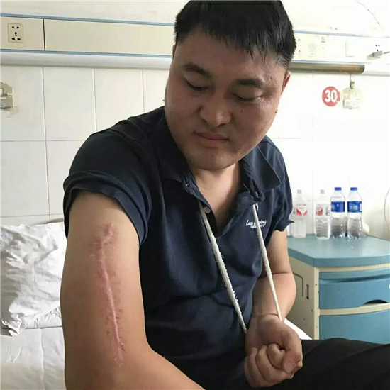 彼時,嫌疑人駕駛三輪車瘋狂逃竄至一片樹林,孫艷峰立即繞過樹林飛奔到嫌疑人車前,同時大聲警告他停車,嫌疑人喪心病狂,加速向孫艷峰撞來,孫艷峰展開雙臂,用自己的身體擋住了嫌疑人的去路,左臂火辣辣的劇痛直鉆心底,嫌疑人跳車奪路而逃。忍著劇痛,孫艷峰只能死死拉住嫌疑人,最終在隊員的配合下,成功將嫌疑人抓獲。這時,孫艷峰才發現自己左肩脫臼、右腿大面積擦傷。將嫌疑人帶回縣辦案中心后,孫艷峰劇痛難忍,到醫院檢查,發現左肩關節盂粉碎性骨折。