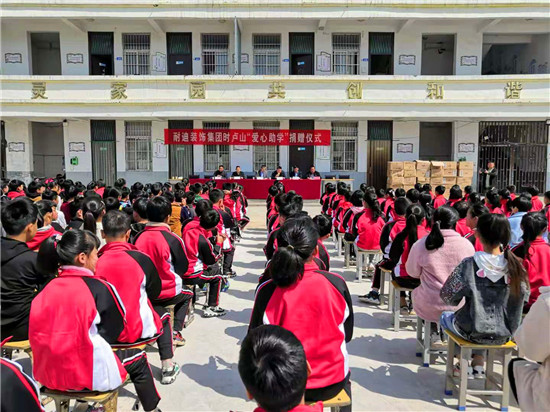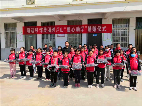 4月6日上午,耐迪裝飾集團董事長時盧山帶著滿滿的愛意,為鄲城縣汲水鄉劉小集小學的孩子們捐贈了360個書包。
