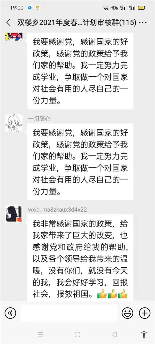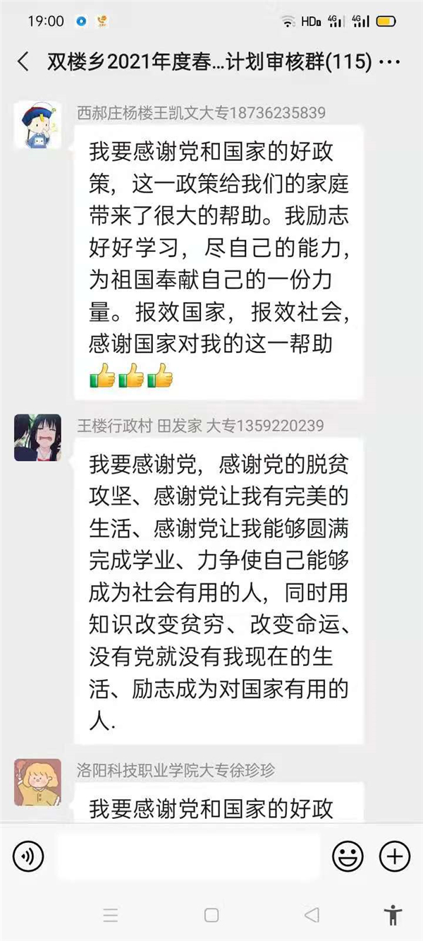 “感謝幫助過我家的所有幫扶人,沒有你們,就沒有我家今天的幸福生活,我們光榮脫貧了,作為貧困家庭中新成長勞動力,我一定珍惜這次來之不易的學習機會,好好學習技術,畢業后回村成為一名技術帶頭人,來促進家鄉產業的發展。”鄲城縣雙樓鄉孫莊村脫貧學生張素華在微信群里說。近幾天,鄲城縣雙樓鄉114人的大學生微信群里可熱鬧了,在鄉黨委政府的引導下,該鄉眾多脫貧后的大學生通過鄉里建起的微信群,紛紛圍繞“話脫貧、感黨恩、奮進新時代”這一主題交流思想,提振斗志。