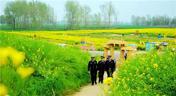 4月10日上午,商水縣公安局組織民警在鄧城鎮6000多畝油菜花海中執勤巡邏,疏導交通,確保游客安全。當日,商水縣首屆金色花田樂游匯暨農特產品展銷會開幕式在此舉行。來自市內外的數萬名游客到這里踏青賞春。