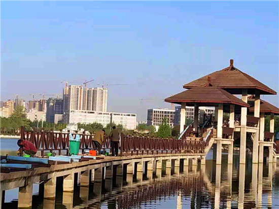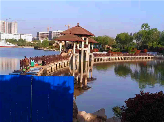 近日,位于文昌大道的周口公園啟動了對水上棧道的維修。周口公園的水上棧道和亭榭是一道美麗的風景,成為人們游園打卡之地,然而因建造時用的是木材,歷經風雨,朽壞嚴重,存在安全隱患,周口公園方面于去年將之封閉。記者在現場看到,工人已經將木質扶欄、道上木板拆除,正在安裝鐵護欄。鐵護欄油漆成棕褐色,依然保持原棧道的風格和色調。②7