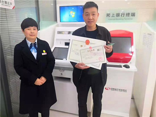 當日,邵先生在鄲城財政局樓下鄲城信用聯社大廳商事登記綜合業務自助一體機上插入身份證,機器面部自動識別后,隨著一體機的一聲“請即時取走您的營業執照”提示,營業執照正副本當即打印出來了。