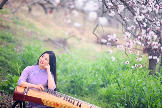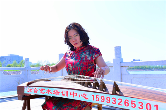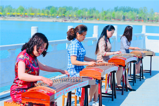 4月22日,鄲城人民公園碧水晴空,一群身著旗袍的女性在這里用古箏演繹著唯美曼妙的曲調。