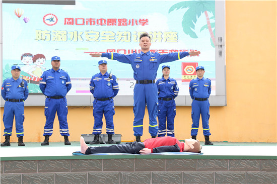 周口市川匯區藍天救援隊對全體師生進行防溺水自救互救知識講座,并現場進行急救演練操作。