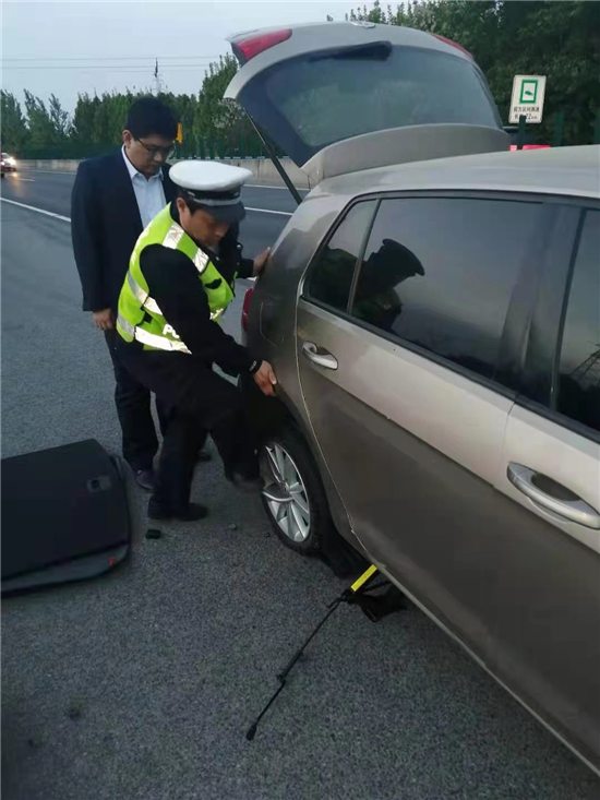 5月2日19時許,市公安局交通管理支隊高速二大隊項城中隊(以下簡稱高速二大隊項城中隊)民警由北往南方向巡邏途中,行駛到2081公里附近西半幅處,發現一輛轎車因車后輪爆胎,被迫停在應急車道,民警隨即幫助該車主更換車載備胎,解決了司機的燃眉之急。