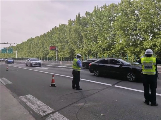 圖片說明:交警在大廣高速與商南高速互通立交南2062公里附近指揮交通