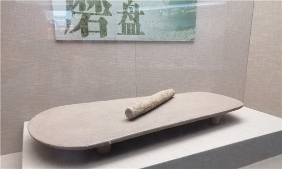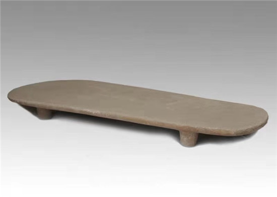 仔細端詳這臺石磨盤,你會發(fā)現(xiàn)它的做工竟如此規(guī)整:由整塊黃砂巖磨制而成,長100厘米,大頭寬44厘米,小頭寬22厘米,厚3.5厘米,表面平坦,沒有任何凹陷痕跡;兩邊呈直線,四角略呈弧形,底部也很平整,還有4個圓柱狀、支撐用的足,足長5厘米左右。試想,在當時生產(chǎn)工具極度落后的時期,要制作如此大而規(guī)整的一個石磨盤,需要耗費多么大的勞動量,需要花上多少年的時間,才能打磨出這么平坦光致的效果?也正因如此,石磨盤成為當時先民的貴重財產(chǎn)。