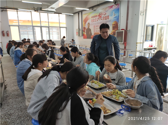 鹿邑縣實驗中學實行班主任陪餐制,4月25日中午,記者見到一邊與學生就餐,一邊與其聊學習、話生活、講未來的李守崗。當問到為何不再修養一段時間時,李守崗說:“這些學生我帶了三年,放心不下呀!”樸實的話語,彰顯的是一名教師對教育的忠誠、對學子的摯愛。