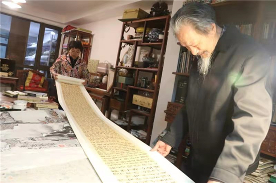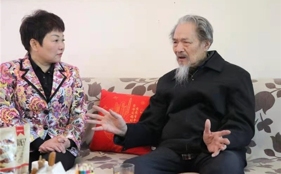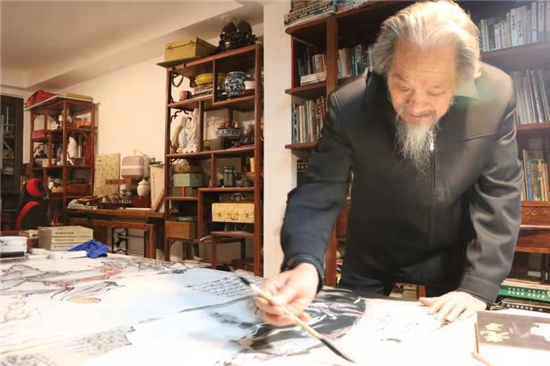 王殿舉先生是從老子故里鹿邑縣玄武鎮(zhèn)走出來的藝術(shù)家,他在七十余年的藝術(shù)生涯中,苦思求索攀登,寓教于藝,創(chuàng)作了大量寶貴的精品力作,生動(dòng)地彰顯了文化藝術(shù)與時(shí)代同行、與社會(huì)共進(jìn)的意義。他“手不停毫”用自己的畫筆繪老子、書陳摶,作品折射著中國時(shí)代與社會(huì)變化的烙印,貼近生活、貼近民風(fēng),真實(shí)而浪漫,歷久而彌新。陽春三月,風(fēng)清日朗。記者一行三人慕名前往鄭州拜訪王殿舉先生。他曾主編新中國成立之后第一部《鹿邑縣志》(120萬字)。退休后一直從事老子文化的研究,出版《老子》傳記(50萬字)。繪畫《老子畫傳》120米國畫長卷,被世界同道會(huì)在釣魚臺(tái)國賓館首展后,在世界各國巡展,而后相繼出版了《畫說老子》叢書八部。他的山水畫作曾被央視七臺(tái)、國務(wù)院扶貧辦、國家博物館和河南省委辦公廳収藏懸掛。聽說他有新作《陳摶傳》即將出版,我們好奇地走進(jìn)了他的工作室,看到了五十余幅有關(guān)《陳摶傳》的國畫創(chuàng)作。他在繼承傳統(tǒng)以線造型的基礎(chǔ)上,容納了光影敷彩和成角透視,提高并增強(qiáng)了畫面的立體感和透視度,使畫作鮮活感人。拜讀他的作品,見畫如讀其文,心神為之一振。