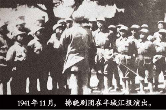 1938年深秋,劇團(tuán)到泌陽縣鄧莊鋪演出,群眾自動地找木棍、找門板、挖土埋柱子,很快搭起一座戲臺,掛上幕布,點(diǎn)燃油燈,男女老少坐在戲臺前的空地上。戲臺上先是演員們合唱抗日歌曲《新四軍軍歌》《游擊隊(duì)歌》《到敵人后方去》等,后演出話劇《突擊》。當(dāng)劇中的老爺爺抱著被日寇殺死的孩子,含淚控訴敵人的暴行時,臺下的觀眾禁不住地憤怒高呼:“打倒日本帝國主義!把日本鬼子趕出中國!”1939年11月初,徐海東隨劉少奇由竹溝到華中路過新興集,彭雪楓命拂曉劇團(tuán)組織一個晚會,以示熱烈歡迎。拂曉劇團(tuán)接受任務(wù)后,大家爭分奪秒,只用了一天時間,就集體創(chuàng)作排練出京劇《徐海東粉碎日寇“掃蕩”》,第二天就在歡迎晚會上演出。
