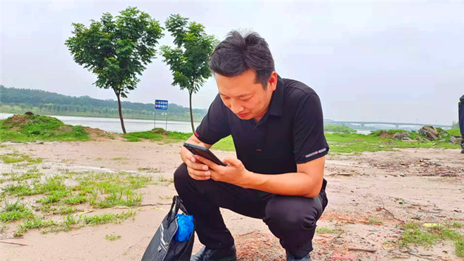 張志新在賈魯河西華城區段采訪汛情后現場寫稿